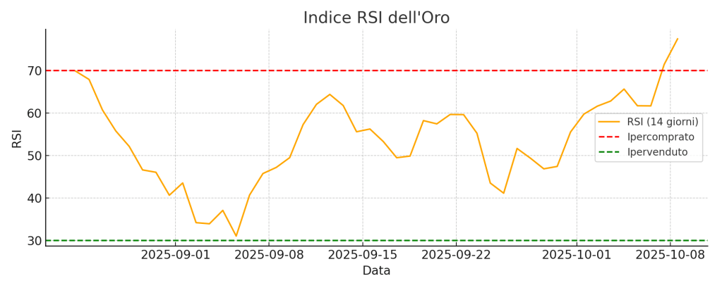 Kitco, nella Gold Market Analysis (8 ottobre 2025), segnala livelli di ipercomprato simili, sottolineando che “il trend resta rialzista ma in fase di stabilizzazione”.