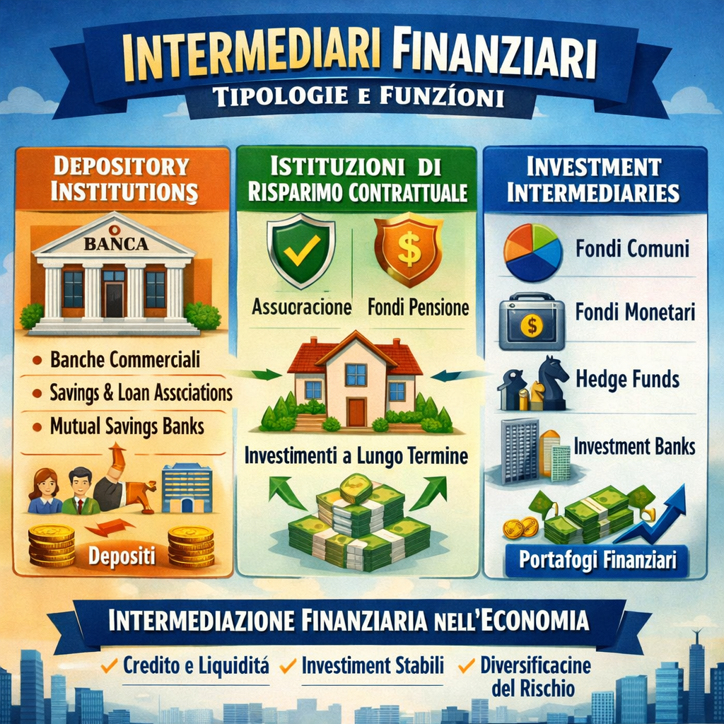 Un intermediario finanziario è un’istituzione che si colloca tra risparmiatori e prenditori di fondi, raccogliendo risorse emettendo passività proprie e impiegandole in attività finanziarie diverse.